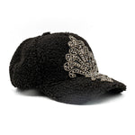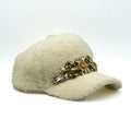 Cappello modello baseball in morbido tessuto boucle, con applicazioni gioiello con strass. Regolabile.