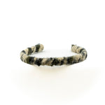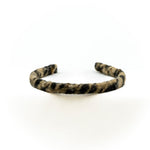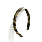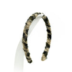 Cerchietto per capelli in morbido tessuto bouclè, stampa maculato in due varianti colore, marrone e verde militare su sfondo beige. Modello piatto effetto fascia.