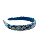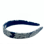 Cerchio-fascia per capelli. Bellissimo tessuto Jacquard a fondo blu. Larghezza di 2 cm. Vedi anche altre misure e fermagli . Fatto a mano. Made in Italy.