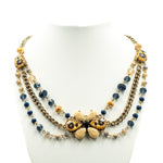 Girocollo a 3 fili pendenti con centrale dal sapore " etnico - folk ". Toni beige e blu montana per le pietre cabochon e cristalli. Finiture in galvanica oro antico. Lavorazione artigianale. Made in Italy.