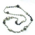 Collana lunga di perle bianche e grigie, impreziosite da piccole applicazioni con strass ematite e cristallo. Comoda chiusura a calamita con strass. Fatta a mano. Made in Italy.