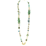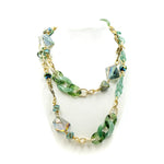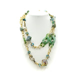 Collana lunga con catene metallo e plexi. Cristalli e forme di vetro nei toni verde acqua per un look davvero speciale.