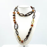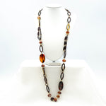 Lunga collana con le pietre naturali e anelli ovali in acetato e metallo. Un mix di forme e materiali preziosi, per un gioiello classico ma anche moderno e glamour. Colori delle pietre corniola e topazio. Lavorazione artigianale. Pezzo unico.