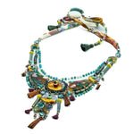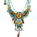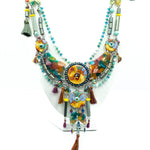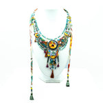 Collana lunga regolabile, con tessuto annodabile. Mix di materiali , acetato di cellulosa, cristalli e nappine colorate. Boho-chic , per un look ricercato e elegante. Fatto a mano, lavorazione artigianale. Made in Italy