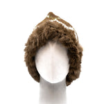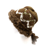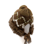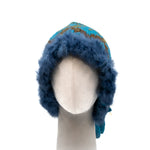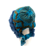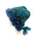 Cuffia - cappello, in morbida lana con disegni geometrici e eco pelliccia . Laccetto in lana per comoda chiusura regolabile.