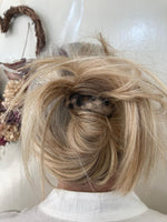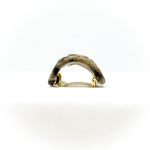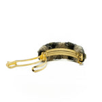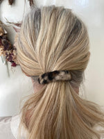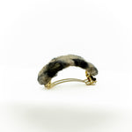Larghezza 16mm, lunghezza totale parte bombata in tessuto 10 cm circa. Lunghezza alla base metallo 7 cm. Diametro di apertura spazio per capelli 3 cm. Galvanica oro.
