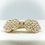Fermaglio a fiocco con mini perle. Chiusura matik. Dimensioni circa 8 cm. Galvanica oro.