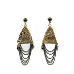 Orecchini con filigrana metallo e frange in catenelle colorate. Pendenti con perline in cristallo. Perno a lobo. Galvanica oro antico. Made in Italy.