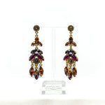 Orecchini con pietre strass navette e cristalli. Colore delle pietre: Viola e lt. ametista. Galvanica oro antico. Perno a lobo. Pezzo unico. Made in Italy.