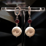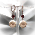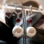 Orecchini pendenti con perle bianche e cristalli, perline rosse e monachella rotonda. Dimensione perla 12mm. Galvanica rodio. Made in Italy.