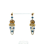 Orecchini pendenti tipo dal sapore "folk", allo stesso tempo eleganti e raffinati. Colori beige e blu. Galvanica oro a spessore. Perno a lobo con punto luce colore topazio. Lavorazione artigianale, Made in Italy.