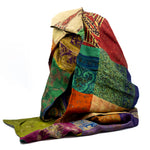 Sciarpa in 100% di pura seta, multi colore tipo "patchwork", double face. Ideale come coprispalle durante fresche serate estive. Prodotto indiano.